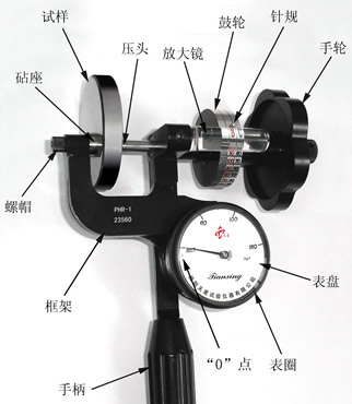 本儀器的設(shè)計(jì)符合洛氏硬度試驗(yàn)的基本定義。與臺(tái)式機(jī)的主要不同點(diǎn)是:其試驗(yàn)力的施加是通過螺桿和一個(gè)已校準(zhǔn)的彈簧完成的;用刻度表測量彈簧位移來確定試驗(yàn)力的大?。粔汉凵疃鹊臏y量由精密螺旋測微機(jī)構(gòu)完成,硬度值的讀取方式是透過放大鏡讀取鼓輪上的刻度線。本儀器的結(jié)構(gòu)如上圖所示