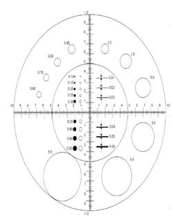 - 關(guān)鍵參數(shù):技術(shù)指標: 1、放大倍數(shù):10倍。 2、物方視場(能夠看到的面積范圍):30mm 。 3、物方工作距離(下面鏡片與被看物的距離):20mm 。 4、系統(tǒng)長度:50mm 。 5、體積尺寸: 50×48mm 。 6、眼瞳距離(上面鏡片與眼睛的距離):10mm。 7.讀數(shù)測量范圍:0~20mm。 8.圓弧測量范圍:0.10~10mm 9.線條測量范圍:0.01~0.08mm 10.測量分劃值:0.1mm