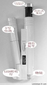 4、兩邊拉開(kāi)電池盒部份燈就會(huì)亮,把觀察物放在防護(hù)罩中心,把眼睛對(duì)準(zhǔn)目鏡,調(diào)節(jié)調(diào)焦齒輪,至看清為止。變倍時(shí)直接把目鏡拉出實(shí)現(xiàn)變倍,然后再調(diào)焦直到看清為止。