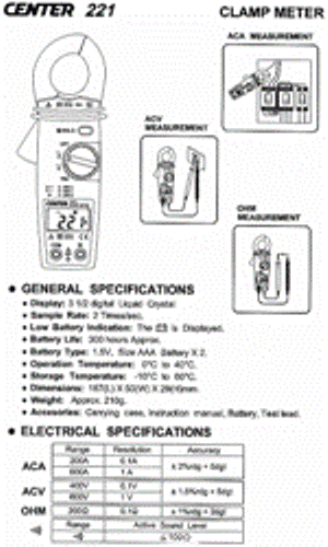 - 關(guān)鍵參數(shù):CENTER-221 鉗表 . DISPLAY: 3 1/2位 LCD 顯示 , ACA : 200A , 600A, ACV : 400V , 600V , OHM : 200Ω