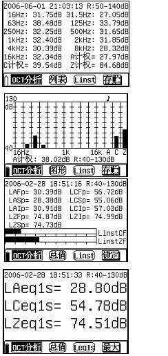 9) 主要測(cè)量界面:列表界面、圖形界面。列表界面和圖形界面可以同時(shí)顯示11個(gè)中心頻率的頻帶聲級(jí)壓以及A、C和Z計(jì)權(quán)聲壓級(jí)。