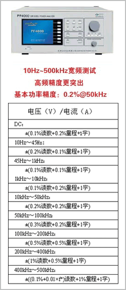 PF4000功率分析儀可解決10Hz~500kHz電信號的精確測量,采用DSP高速采樣、低失真寬帶取樣、信號實(shí)時(shí)分析、PLL鎖相環(huán)同步,線性濾波,過零濾波等國際先進(jìn)技術(shù),保證各種非周期波及高頻信號的精確測量,大屏幕液晶顯示所有測試數(shù)據(jù)與波形,無需電腦即可獨(dú)立工作。10Hz~500kHz寬頻測試,高頻精度更突出,功率基本精度為0.2%@50kHz。