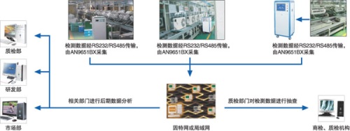 系統(tǒng)的主要功能是通過各個檢測崗位的電氣安全綜合測試儀在線檢測,并快速、準確地將檢測到的原始數據通過遠程檢驗系統(tǒng)上傳到企業(yè)端的計算機上,并自動判定檢測數據是否合格;數據加密后通過網絡傳到企業(yè)和檢驗檢疫機構的服務器端,服務器端將數據解密并存儲在數據庫內;企業(yè)各個相關部門和商檢、質檢機構的檢驗人員通過終端軟件可以查看每批貨物的真實檢測數據,實現(xiàn)數據共享。