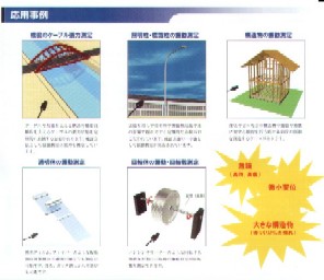 斜拉橋纜索、電桿或照明柱、車輛經(jīng)過時橋梁振動狀況、比常規(guī)探頭還小的電子零件微小振動測定、機械振動、住宅和建筑物測量(同時測定縱擺動及橫擺動)